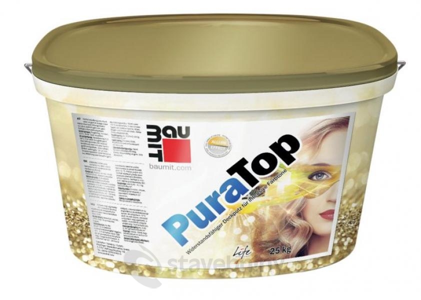 Baumit PuraTop je pastovitá tenkovrstvá omítka pro intenzivní a zářivé barevné odstíny. Vysoce stálobarevná, s technologií cool pigmentů, použitelná v exteriéru. Vzájemná shoda fasádní nátěrové hmoty a omítky stejného barevného odstínu definovaného vzorníkem, popř. shoda různých struktur barevné omítky, nemusí být za určitých okolností dosažitelná, neboť stejný odstím může být na různých strukturách za určitých světelných podmínek vnímán rozdílně. Doporučujeme Vám proto nejdříve aplikovat zkušební vzorek nebo kombinaci zkušebních vzorků a poté objednat Vámi zvolený barevný odstím omítky Baumit.