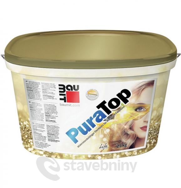 Baumit PuraTop je pastovitá tenkovrstvá omítka s multifunkčním drypor efektem bránícím biologickému znečištění a unikátní recepturou zvyšující efektivitu při zpracování. Vysoce paropropustná, odolná vůči znečištění, snadno zpracovatelná, použitelná v exteriéru. Vzájemná shoda fasádní nátěrové hmoty a omítky stejného barevného odstínu definovaného vzorníkem, popř. shoda různých struktur barevné omítky, nemusí být za určitých okolností dosažitelná, neboť stejný odstím může být na různých strukturách za určitých světelných podmínek vnímán rozdílně. Doporučujeme Vám proto nejdříve aplikovat zkušební vzorek nebo kombinaci zkušebních vzorků a poté objednat Vámi zvolený barevný odstím omítky Baumit.